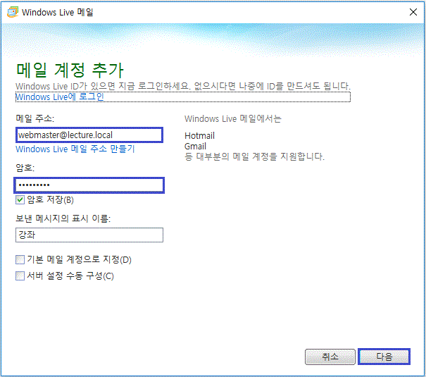 1) 아래와 같이 메일주소, 암호, 표시이름을 입력합니다.