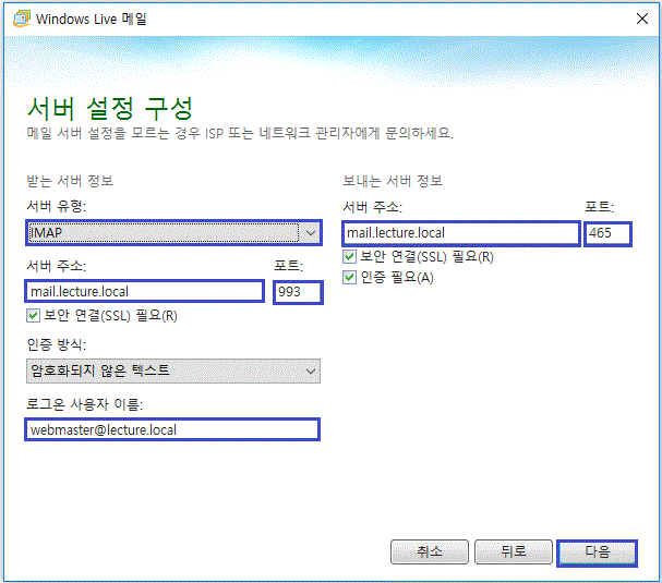 - 서버 주소 : mail.lecture.local