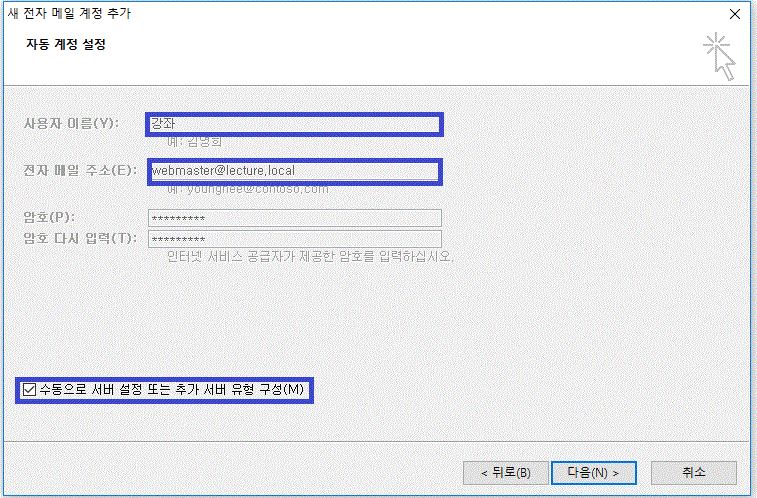자동 설정이 될 경우, 수동으로 서버설정 또는 추가 서버 유형 구성을 체크 해제한 상태에서 진행하시면 됩니다.