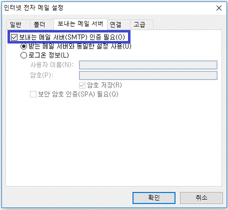 6) 보내는 메일서버(SMTP) 인증 필요에 체크합니다.